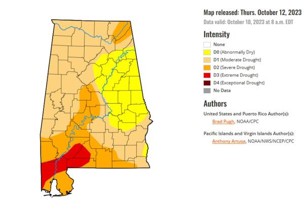 根据干旱监测,该州的其他地区并没有正式处于干旱状态,但已经处于干旱的边缘。这些地点大多在阿拉巴马州的中东部。