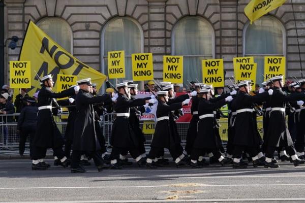 当查尔斯国王乘坐马车从白金汉宫抵达白厅时,数十名竞选组织“共和”的成员高呼“不是我的国王”、“真是浪费钱”和“打倒王室”,发出了响亮的嘘声。