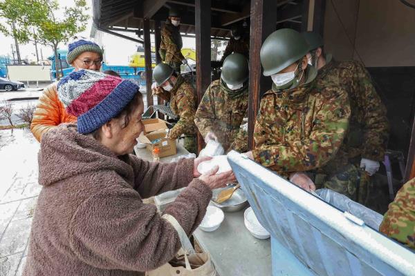 一名妇女从日本自卫队领取食物2024年1月7日,石川县诺东地区在元旦发生7.5级大地震后,在石川县苏足市的隧道里。JIJI PRESS /法新社摄